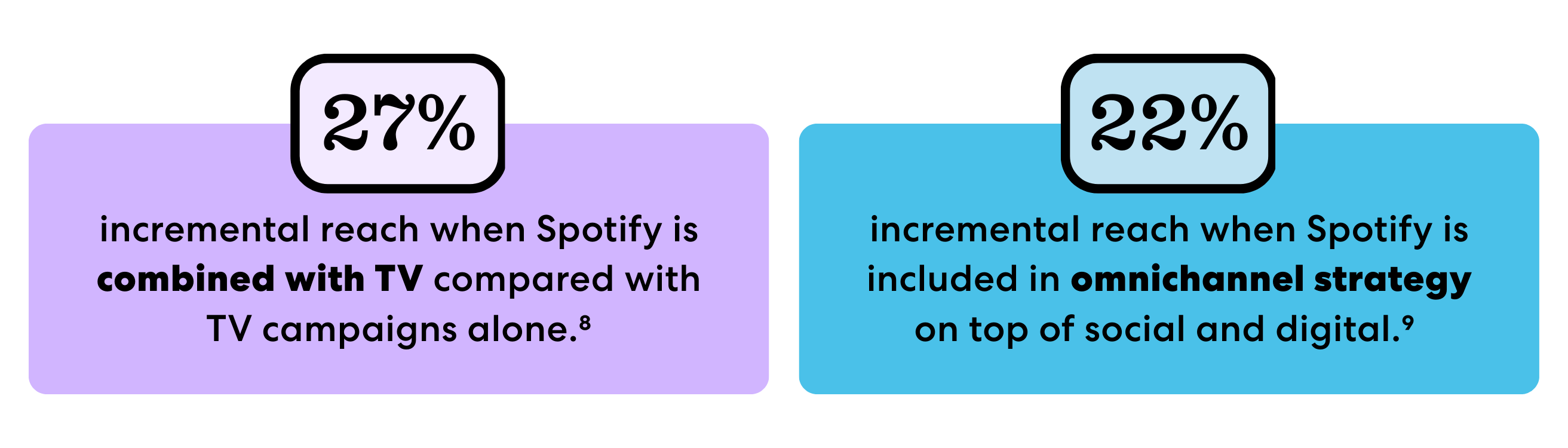 A great example is the combination of audio and CTV. When we’ve combined Spotify with TV, campaigns delivered 27% incremental reach on top of TV campaigns alone.⁸ In a similar fashion, Spotify included in omnichannel media mixes adds 22% incremental reach on top of social and digital.⁹