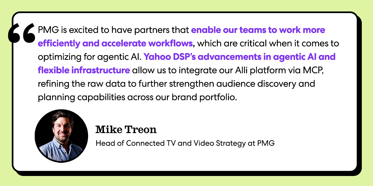 - Yours: External Agents via MCP - Through our investment in foundational infrastructure, such as Model Context Protocols (MCPs) and open agentic APIs, external AI agents can securely access Yahoo DSP tools and raw data. This enables seamless cross-platform workflows. A common use case is cross-platform budget management. A client’s agent can pull campaign details from Yahoo DSP, such as budgets, pacing, bid exclusions and combine them with data from other DSPs. The agent can then recommend reallocations toward the platforms and tactics driving the strongest outcomes and execute those changes without ever logging directly into Yahoo DSP. Today, Audience Exploration via MCP is live, allowing partners to access raw data through APIs or MCPs to deepen audience discovery and planning.