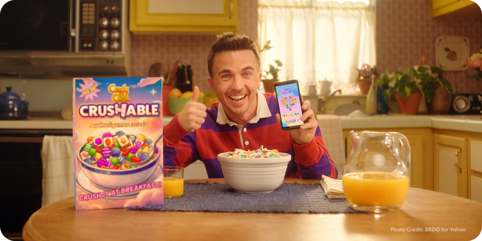 “Games have become part of our morning routines, right alongside checking news or email,” said Josh Line, chief marketing officer at Yahoo. “Many of us remember when mornings meant a bowl of cereal and our favorite TV show. With this spot, we wanted to tap into the shared nostalgia for the slightly chaotic cereal commercials of the 90s, but give it a modern twist with Crushable. And because so many of us feel like we’ve already been at the breakfast table with Frankie, he felt like the perfect fit.”